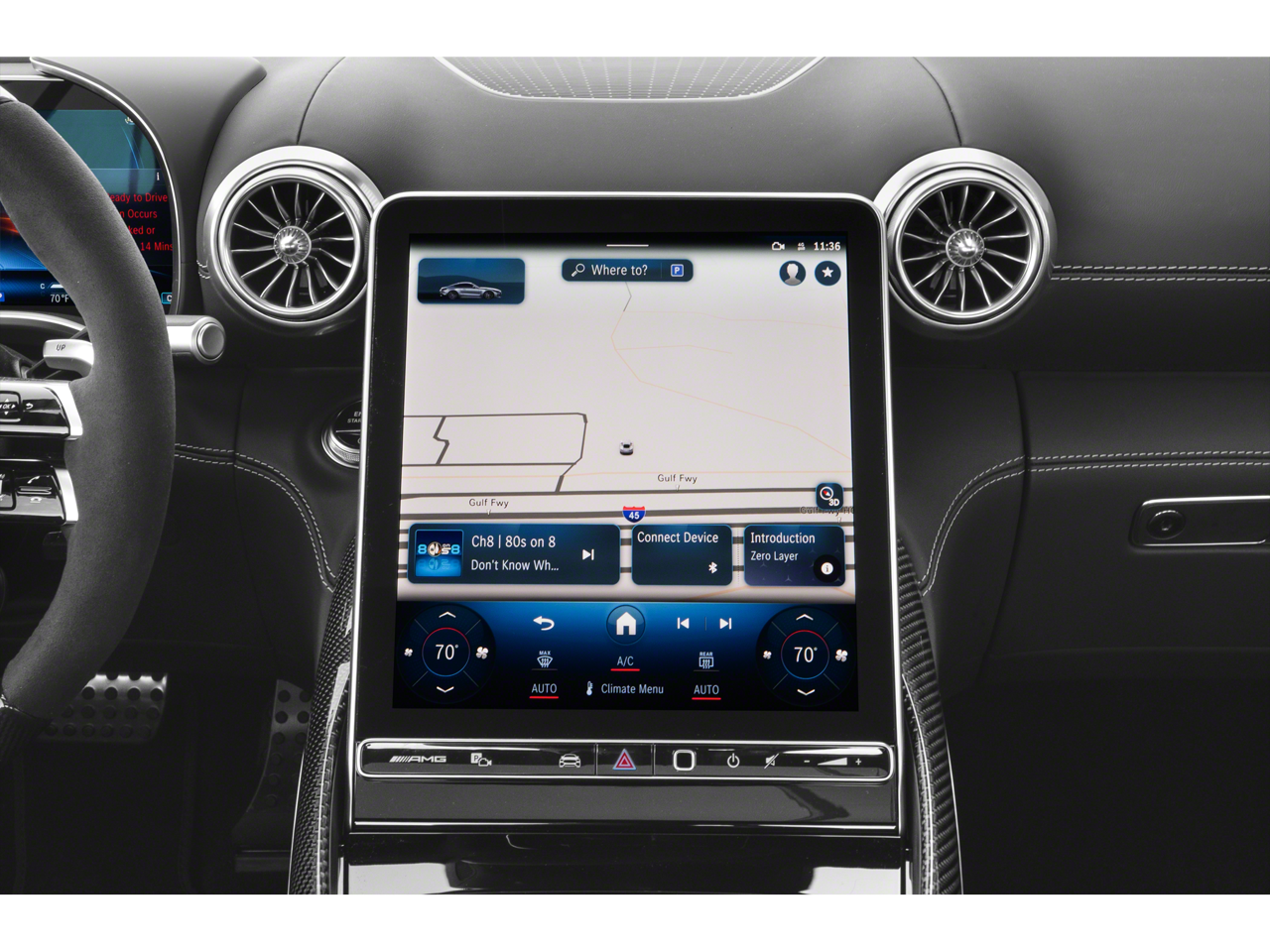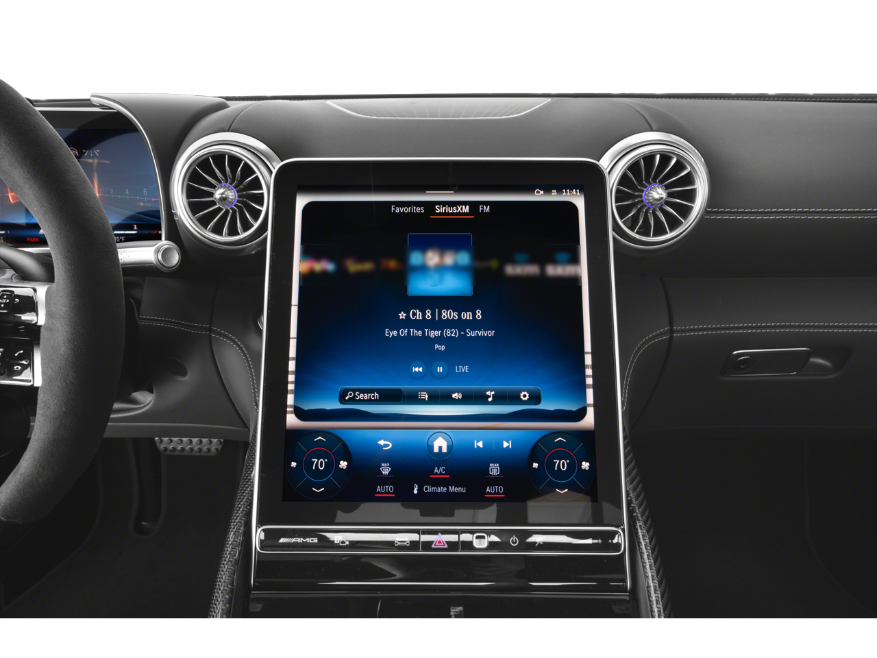 Step inside and the cabin welcomes you with a driver-focused environment crafted from premium materials. The AMG Performance Steering Wheel in Nappa Leather, 12.3-inch Digital Instrument Cluster, and 12.3-inch Center Display create a seamless blend of motorsport inspiration and cutting-edge technology. Comfort and convenience are elevated with Heated Front Seats, Multi-Color Ambient Lighting, Burmester Surround Sound System, and the intuitive MBUX Multimedia System with Navigation Premium.
